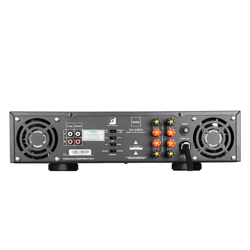 - Khả năng vận hành bền bỉ nhờ mạch cảm biến tự động thông minh: Nhờ được trang bị các mạch cảm biến nhiệt tự động, amply Paramax DA-2500 đảm bảo an toàn cho người dùng trong quá trình sử dụng cũng như có độ bền cao hơn. Cụ thể, khi nhiệt độ bên trong amply đạt đến 90°C, bộ khuếch đại sẽ tự động ngắt kết nối với loa. Khi nhiệt độ giảm xuống còn 88°C, bộ khuếch đại sẽ tự động trở lại hoạt động bình thường. Ngoài ra, sản phẩm còn được trang bị hệ thống tỏa nhiệt thông minh, hệ thống này sử dụng quạt và cánh tản nhiệt nhôm để giữ cho nhiệt độ của amply luôn duy trì ổn định, đồng thời giảm thiểu độ ồn xuất phát từ quá trình làm mát. Điều này giúp amply vận hành êm dịu và an toàn trong thời gian dài sử dụng.