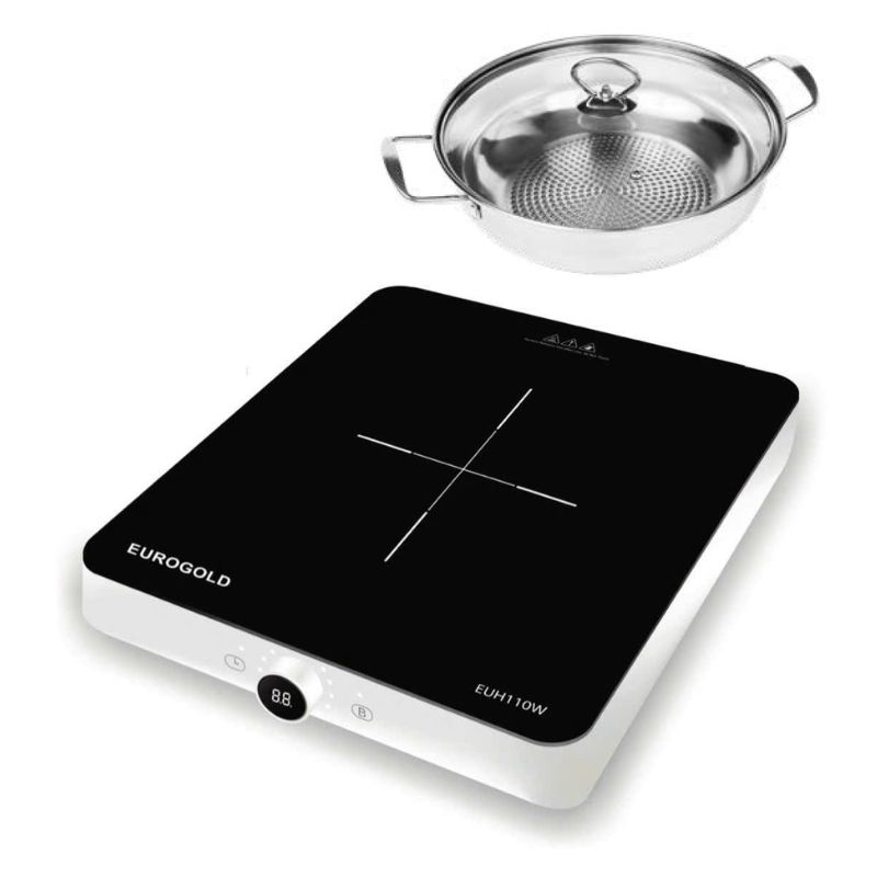 - Bếp từ đơn Eurogold EUH110W chỉ có duy nhất một lò với công suất là 2000W, nhiệt độ tối đa lên tới 280ºC. Bếp từ đơn đặc biệt tiện dụng trong các tiệc lẩu đối với các hộ gia đình. Do sử dụng nguyên lý cảm ứng điện từ nên hiệu suất nấu nướng cực nhanh, lên tới 90% và rất an toàn.