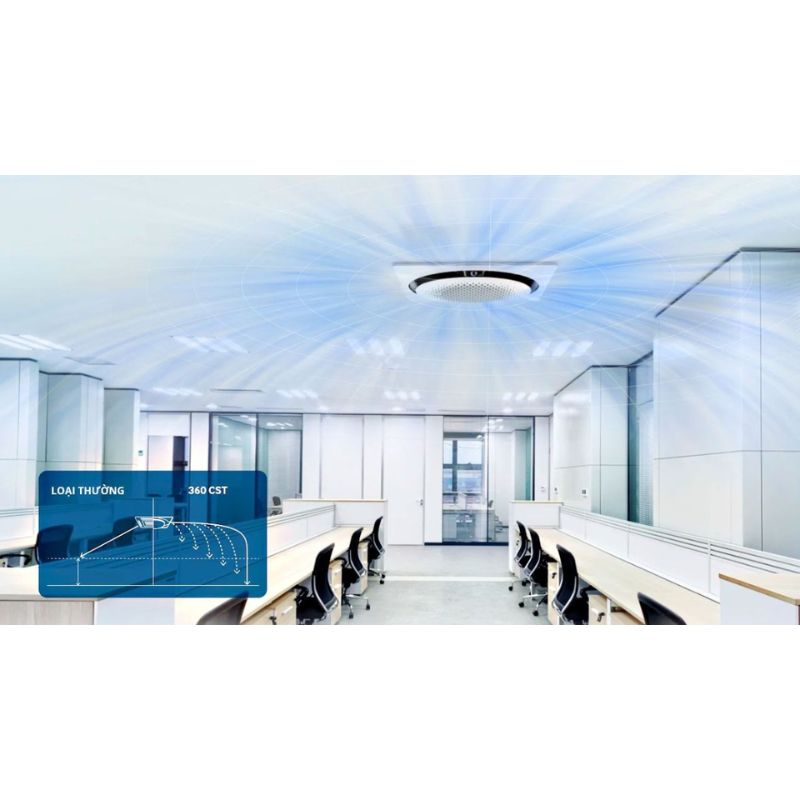 - Công suất làm lạnh lớn, phân tán hơi lạnh đồng đều 360 độ: Chiếc máy lạnh Samsung 1 chiều này sở hữu mức công suất là 4HP. Do đó máy sẽ đáp ứng được nhu cầu làm mát của những không gian thương mại, có diện tích tích lớn từ 40 – 60m². Đồng thời máy cũng sử dụng động cơ 3 pha nên hoàn toàn phù hợp với môi trường công nghiệp. Mặc dù thiết bị cho ra lượng hơi lạnh mạnh mẽ nhưng người dùng không cảm thấy bị giá buốt nhờ vào thiết kế thông minh của máy. Cụ thể với thiết kế dàn lạnh hình tròn, hơi lạnh sẽ được phân tán đồng đều 360 độ đến mọi vị trí trong phòng. Chính vì thế mà người dùng nhanh chóng có được cảm giác mát mẻ, thoải mái và dễ chịu.